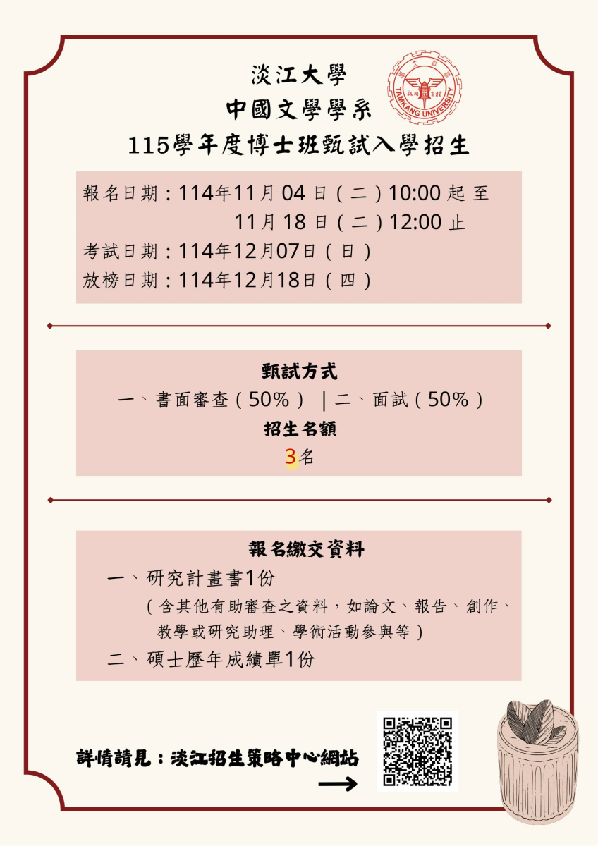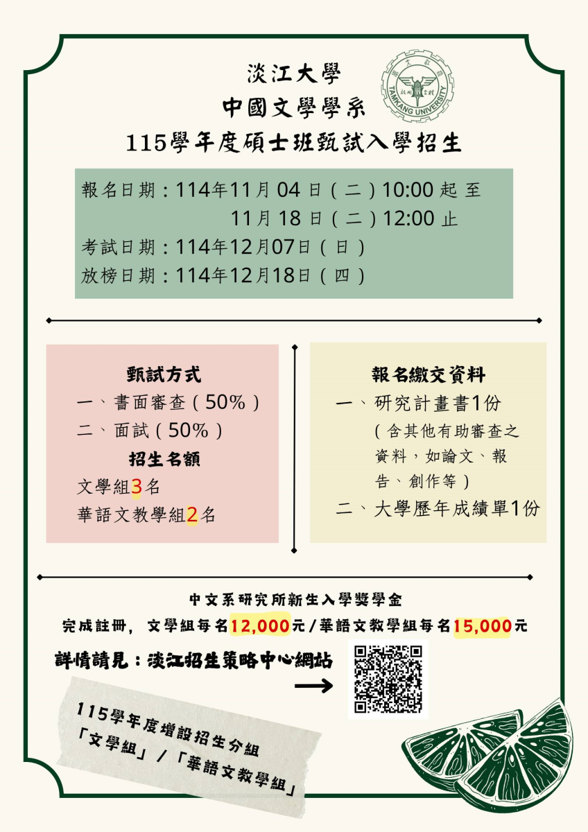 1. 115學年度碩博士班甄試入學招生重要日程 ※ 報名日期:114年11月04日(二)10:00至11月18日(二)中午12:00止。 ※ 考試日期:114年12月07日(星期日)。 ※ 放榜日期:114年12月18日(星期四)。 ※ 碩士班名額:5名(文學組:3名、華語文教學組:2名)。 ※ 博士班名額:3名。 2.招生簡章:請參閱本校招生中心公告。 3.網路報名:我要報名 (← 點選「入學管道」→「研究所」→「碩士班/博士班」→「網路報名」) (114年11月4日上午十點開放網路報名)